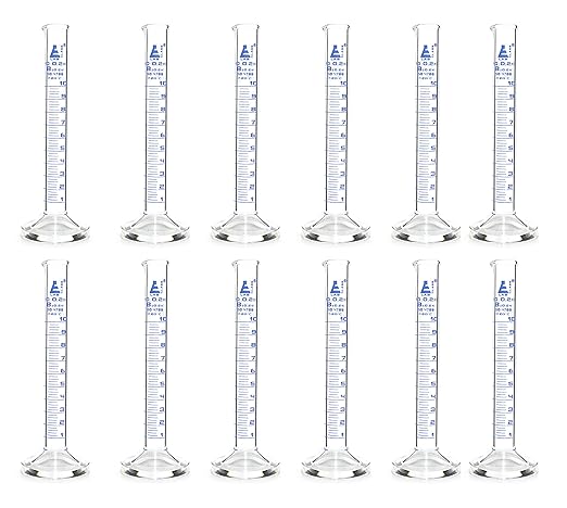 Made of borosilicate glass, this cylinder has a capacity of 10mL. The graduations are clearly labeled in blue. It features a 1.75-inch diameter base and measures 0.55 inches in outer diameter and 0.43 inches in inner diameter.