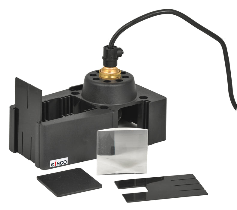 EISCO Ray Box: This traditional ray box features three openings, allowing two sets of pupils to use it simultaneously. The two side openings have two slots each for accommodating 50 mm slide accessories and blanking plates. A front opening provides seven grooves for accessories and lenses, designed to produce divergent or convergent rays through the slit plate when used with a biconvex cylindrical lens of 75 mm focal length. This ray box requires only a minimum of accessories to cover a wide range of optics experiments. It comes supplied with 2 meters of flexible cable, two 4mm plugs, a 12V - 24W B15 bulb, a bulb holder, a slit plate, and aluminum blanking plates. Working instructions are also included.