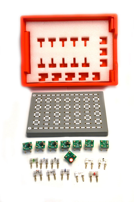 Here is the corrected text: The Electronics Systems Kit allows multiple electronic samples to be built for educational purposes. The kit comes with a plastic case and lid to keep all contents organized. This equipment kit is ideal for outfitting a new physics classroom or enhancing an existing one, covering endless topics. The Electronics Systems Kit enables students to build the following projects: * A forward bias diode * A half-wave rectifier * A Zener Diode * Using a transistor as a switch * Measuring power gain with a PNP power transistor * Infrared Diode and Phototransistor * Light-Dependent Transistor * Temperature-Dependent Resistors * Silicon-Controlled Rectifier (SCR) * TRIAC - Thyristor The kit contains the following components, along with a plastic case and lid: * Board for Electricity and Electronics * 1 Si Diode * 2 Zener Diodes * 1 Red LED Diode * 1 Green LED Diode * 1 Infrared (IR) Diode * 1 Photoresistor * 1 Light-Dependent Resistor (LDR) * 1 NTC Resistor * 1 PTC Resistor * 1 NPN signal transistor * 1 PNP signal transistor * 1 NPN power transistor * 1 PNP power transistor * 1 Silicon-Controlled Rectifier (SCR) * 1 TRIAC * 1 Unijunction Transistor (UJT)