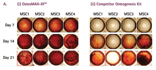 ecially formulated to readily differentiate human mesenchymal stem cells (MSCs) into mature osteocytes as assessed by alizarin red and alkaline phosphatase staining.