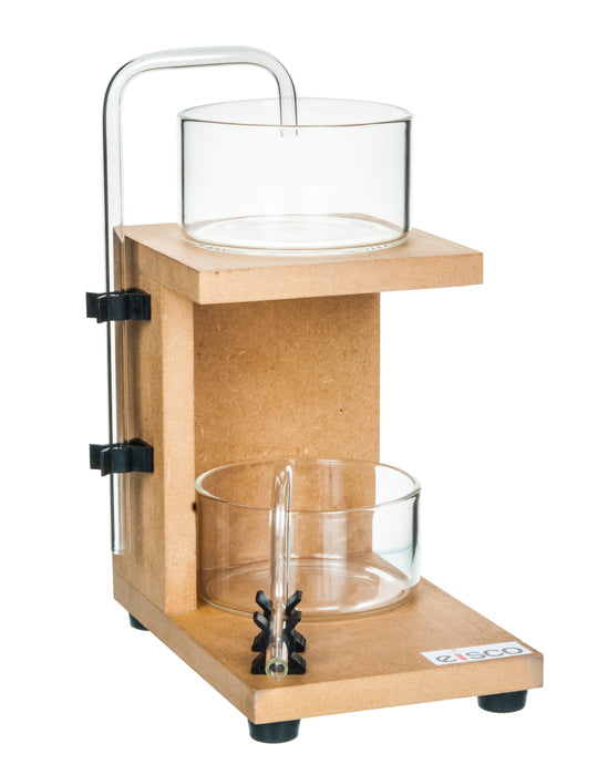 This unit consists of two 80mm-diameter basins and specially shaped glass tubes, as shown in the figure. It is supplied on a stand and is designed for use with a turbine/pump unit. This product allows for the demonstration of the conversion from electrical to kinetic energy in the pump and potential energy in the head of water, offering both open and closed system options. The complete package includes two basins and shaped glass tubes, featuring an upper platform with a 38mm-diameter hole that enables use as a simple recirculation system with a single reservoir.
