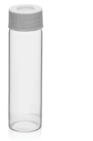 Pack of 100, 40mL clear vials are certified for volatile organic analysis and total organic carbon Made from 51 expansion Borosilicate glass conforming to USP Type I and ASTM E438 Type I, Class B requirements, with a coefficient of linear expansion = 54x10°C Caps and seals are manufactured from high purity polypropylene with a silicone/PTFE injection septa Vials have a stable flat bottom for most sampling & analysis applications Vials and caps are preassembled and shrink wrapped into trays to reduce contamination Clear VOA/TOC vials with a 40ml capacity. The high quality borosilicate glass construction meets ASTM E438 Type I Class B and USP Type I standards and has a coefficient of linear expansion of 54x10°C. Vials have flat bottom for maximum stability. Caps and seals are manufactured from high purity polypropylene with silicone/PTFE injection septa. Each vial measures 3.75" (95mm) tall, and has an outer diameter of 1.1" (28mm). Pack of 100.