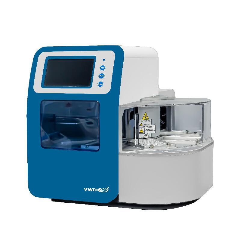 Memory: 100 programs (internal memory), Power: Universal 120 to 240VAC, VWR® 96 Sample Purification System is a high throughput, automated system that improves the efficiency and reproducibility of magnetic bead-based purification protocols., Capable of processing up to 96 samples at one time, the VWR® 96 Sample purification system is easy to set up and program. Mixing, magnetic bead transfer, washing, and elution steps are performed automatically. The purification process can be completed within 10 to 60 minutes depending on the type of reagent kit used and complexity of the program. | Programming | The VWR® 96 Sample purification system can be programmed by using the integrated touchscreen or the included mouse. No external PC is required. After a protocol has been created, the instrument will calculate and display the estimated time for each step and the total processing time. | Typical step settings include: | Tip comb loading and unloading: Automate the tip comb loading and unloading by designating the respective plate positions in the script. | Mixing: Parameters for mixing time, speed, and amplitude can be programmed for each step of the protocol. | Temperature control: Heating of the sample mixture during the lysis and elution steps significantly improves the purity and yield of the target molecule. The VWR® 96 Sample purification system is equipped with 2 heating blocks on the plate carousel that can be precisely set to temperatures from ambient 5 to 120 °C. Deep well plates fit into the heating blocks for efficient heat transfer. A cooling fan inside the processing chamber maintains the ambient operating temperature to ensure consistent results. | Bead collection and release: The complete collection of magnetic beads from sample mixtures is crucial for maximizing the yield of purified analytes. The system’s software offers full control of magnetic parameters to ensure cleaner extractions. General settings allow control of magnet speed, position, repeat collection cycles, etc., to guarantee consistent yields. | Protocol Optimization | The VWR® 96 Sample purification system has been validated with several magnetic bead kits from leading manufacturers and a number of optimized protocols for specific applications are available. To request scripts for specific kits, or for assistance in optimization, please contact VWR® Technical Support Team at TechnicalProductSupportNA@vwr.com. | Chamber UV Sterilization | An ultraviolet sterilization lamp (UVC) inside the processing chamber provides effective elimination of most bacterial, viral, and stray genomic DNA contaminants. This additional safeguard reduces the possibility of unwanted DNA/RNA contamination of critical samples that could be amplified downstream in a PCR detection assay. UV sterilization time can be adjusted based on specific program requirements to ensure a sterile environment prior to purification. | Communication Ports | The VWR® 96 Sample purification system can store up to 100 program files which can be transferred between instruments, or to a computer for storage or sharing. Simply insert the included flash drive to export the selected files. Programming control can be done via the touchscreen, or by using the included mouse. A PC can also be connected for remote programming. | VWR® Consumables | VWR® offers high-quality deep well plates and magnetic tip combs designed to fit the VWR® 96 Sample purification system., 02_BulletPoint: Compatible with all popular magnetic bead kits | On-board programming with a touch screen control panel | Process up to 96 samples in deep-well plates | 8 position carousel with 2 heating positions | Sample volume 50 to 1000 µl, 08_Certifications: CE Mark, VWR® 96 Sample purification system 230 V, Model: 96 Sample Processing System, Communication ports: USB, LAN, & PC, Contamination control: UV lamp (3W, 253.7nm UVC wavelength), Elution temperature range: Ambient 5°C to 120°C, Internal lighting: LED, Lysis temperature range: Ambient 5°C to 120°C, Plate positions: 8, Programming control: Touch screen/mouse or PC connection, Magnetic bead recovery rate: > 95%, Dimensions: 21.6 x 24.4 x 18.9 in. (55 x 62 x 48 cm), Display: 7.0 inch-color touch screen, Mixing speed range: Variable, 10 levels, Warranty: 2 Years, Weight: 54 kg / 119 lbs, Capacity (Samples/Run): 96 samples / 50 µl to 1000 µl, Cat. No.: 77321-886, Sufficient for: 96 samples, Memory: 100 programs (internal memory), Power: Universal 120 to 240VAC, VWR® 96 Sample Purification System is a high throughput, automated system that improves the efficiency and reproducibility of magnetic bead-based purification protocols., Capable of processing up to 96 samples at one time, the VWR® 96 Sample purification system is easy to set up and program. Mixing, magnetic bead transfer, washing, and elution steps are performed automatically. The purification process can be completed within 10 to 60 minutes depending on the type of reagent kit used and complexity of the program. | Programming | The VWR® 96 Sample purification system can be programmed by using the integrated touchscreen or the included mouse. No external PC is required. After a protocol has been created, the instrument will calculate and display the estimated time for each step and the total processing time. | Typical step settings include: | Tip comb loading and unloading: Automate the tip comb loading and unloading by designating the respective plate positions in the script. | Mixing: Parameters for mixing time, speed, and amplitude can be programmed for each step of the protocol. | Temperature control: Heating of the sample mixture during the lysis and elution steps significantly improves the purity and yield of the target molecule. The VWR® 96 Sample purification system is equipped with 2 heating blocks on the plate carousel that can be precisely set to temperatures from ambient 5 to 120 °C. Deep well plates fit into the heating blocks for efficient heat trans