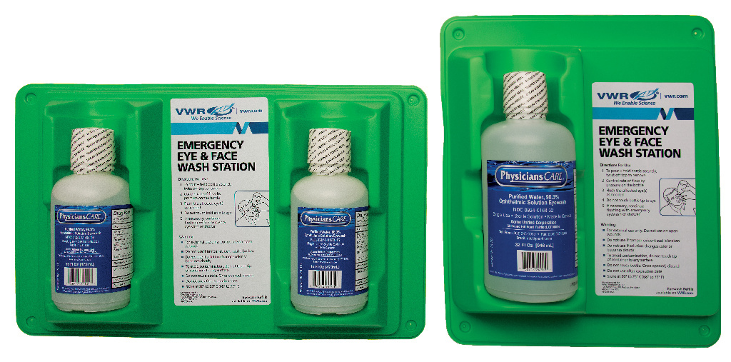 Here is the corrected text: VWR eyewash stations are wall-mountable, providing quick access in emergency situations. The stations are configured to hold one or two bottles, available in 16-ounce and 32-ounce sizes. PhysiciansCare sterile isotonic buffered eyewash solution helps clear eyes of foreign material such as dust, pollen, and chemicals, and relieves itching and burning of the eyes and skin. The plastic squeeze bottle with a tear-off top helps create a fluid stream to direct the solution into the affected areas. For solution refills, please see items 76049-014 (16 ounces) and 76049-016 (32 ounces). Features: * Wall-mountable stations in single or double configurations * 16-ounce and 32-ounce bottle options * Includes PhysiciansCare eyewash solution Available models: * Eyewash station, single 32-ounce bottle, dimensions: 11.5 x 4 x 15 inches (Cat. No.: 76049-030) * Eyewash station, double 16-ounce bottles, dimensions: 17.5 x 4 x 11 inches (Cat. No.: 76049-028) * Eyewash station, single 16-ounce bottle, dimensions: 15 x 4 x 11 inches (Cat. No.: 76049-022)