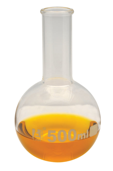 500ml capacity boiling flask made out of high quality, heavy duty borosilicate glass. Narrow neck, beaded rim and rounded bottom. No stopper included. Flask measures 6.75" tall.