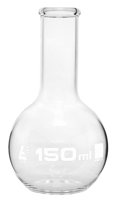 150ml capacity Florence boiling flask made of high quality, heavy duty borosilicate glass. Narrow neck, beaded rim and flat bottom. No stopper included. Flask measures 5.25" tall.