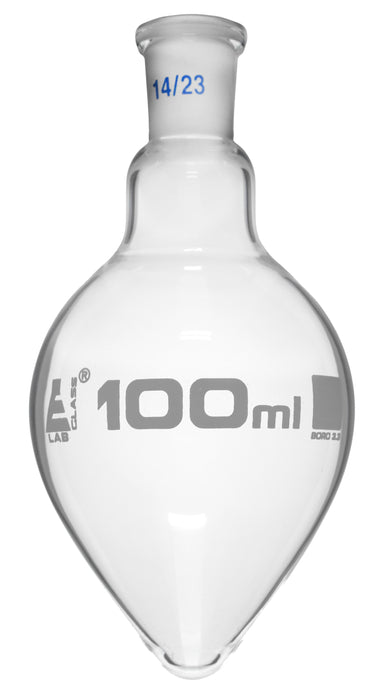 This 100ml capacity, pear-shaped boiling flask is made of high-quality, heavy-duty 3.3 borosilicate glass. It features a single, interchangeable joint with a 14/23 size socket, but no stopper is included. The flask stands 5 inches tall and measures 2.5 inches in diameter at its widest point, with a neck diameter of 26mm. Eisco Labs Borosilicate glass has the following heat tolerances: strain point -515°C, annealing point 565°C, and softening point 820°C.