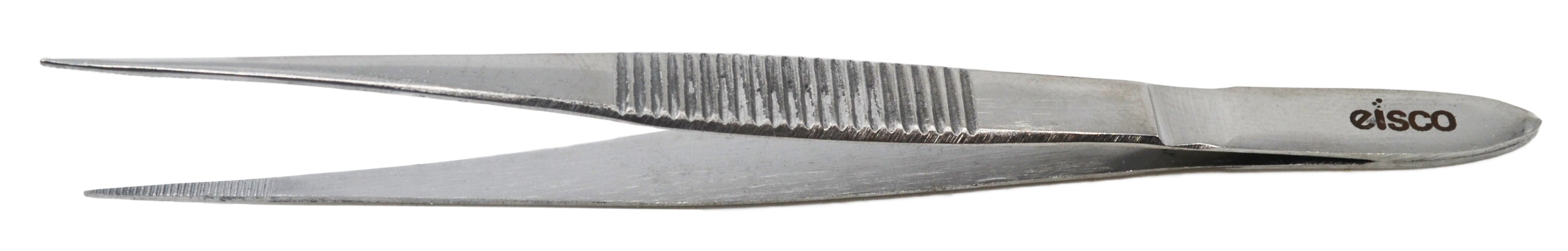 Rustproof, anti-magnetic stainless steel tweezers feature a pointed end and serrated point, making it easy to grip items. Primarily used for microscopy applications, these forceps measure 4.5 inches long and 0.3 inches wide, opening to 10.5mm at their fullest extent. Designed for professional laboratory use, they are also an ideal choice for science classrooms and household applications.