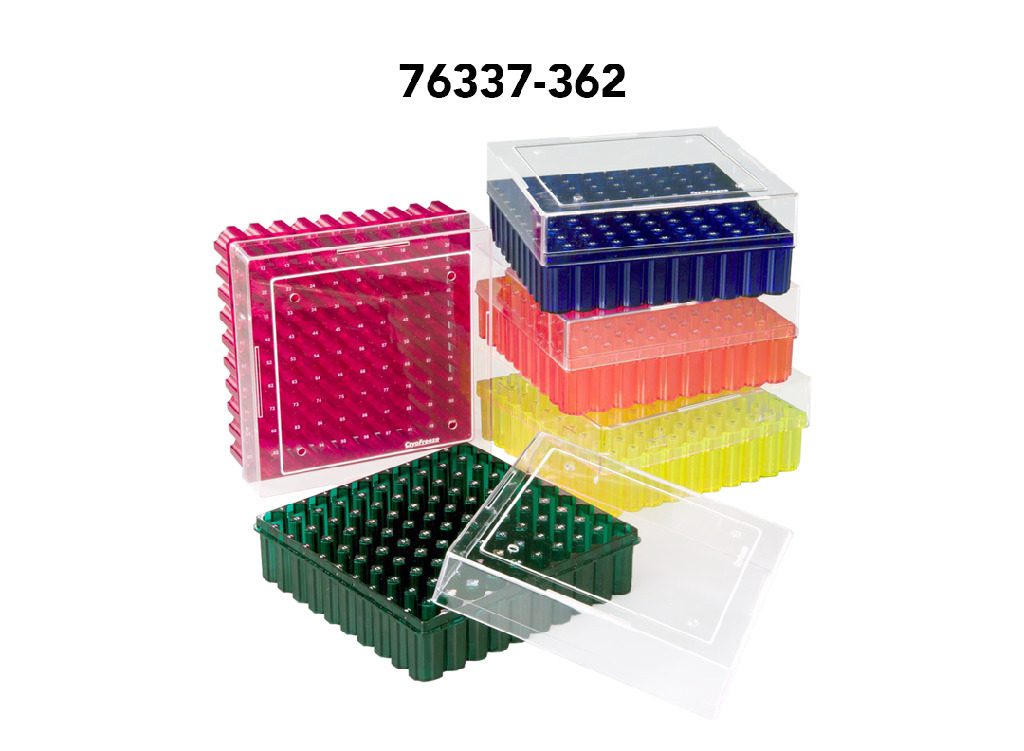 These racks are ideal for long-term cryogenic storage. Maximum tube dimensions are 12×49 mm (fitting cat. nos. 76337-368, 76337-366, and 76337-362) and 12×90 mm (fitting cat. no. 76337-364). Features include: • Drains and vents that prevent pressure build-up • Crystal-clear lid providing sample visibility • Alphanumeric indexing for greater organization The racks are available in assorted colors (blue, green, red, orange, and yellow) and come in various dimensions: 76×76×54 mm (cat. no. 76337-368, for 25×1.0/1.8 ml tubes), 133×133×54 mm (cat. no. 76337-366, for 81×1.0/1.8 ml tubes), 133×133×95 mm (cat. no. 76337-364, for 81×4.5 ml tubes), and 133×133×54 mm (cat. no. 76337-362, for 100×1.0/1.8 ml tubes).