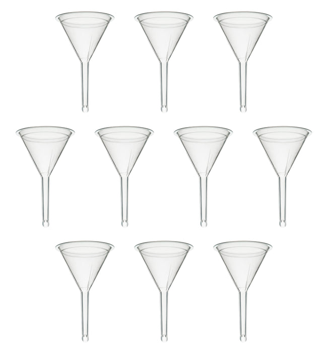 Here is the corrected text: Pack of ten industrial-quality filter funnels made of polypropylene plastic. Excellent for separating solids from liquids, as well as for easier transfers of liquids to narrow-mouthed containers. Each funnel measures 3.7 inches in total length and 3 inches in diameter. The stem is 3 inches long and has an outer diameter measuring 6.7mm. Designed for use in professional laboratories, but ideal for science classrooms and household use. Eisco Labs proudly manufactures its own products using state-of-the-art equipment and follows the highest standards of quality control. Each product is carefully designed by a team of laboratory professionals and experienced engineers with quality and durability in mind. They are manufactured with only the highest-grade raw materials and according to international quality standards to ensure that they can withstand use in even the toughest laboratory environments.