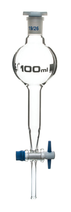 Here is the corrected text: Gilson-style separating funnels are made of high-quality, heavy-duty borosilicate glass. They feature a 19/26 size socket with an interchangeable plastic stopper and have a 100ml capacity. The funnels come equipped with a PTFE key stopcock, making them perfect for any science or home laboratory. The funnel measures 11.25 inches tall, with a body diameter of 2.5 inches. The stem is 2.5 inches in length, with an inner diameter of 5mm and an outer diameter of 8mm. Eisco Labs borosilicate glass has the following heat tolerances: strain point -515°C, annealing point 565°C, and softening point 820°C.