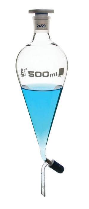 Here is the corrected text: Premium Conical Squibb-style bent arm Separatory Funnel with a generous 500mL capacity, crafted to meet industrial quality standards. This funnel is constructed from heavy-duty borosilicate 3.3 glass, ensuring exceptional durability and the ability to endure high temperatures and thermal shocks. It is perfectly suited for separation procedures, enabling the efficient division of mixture components into two immiscible liquids with differing densities. The integrated rotaflow stopcock enhances precision by allowing meticulous drop-wise dispensing of the denser separated liquid. The funnel features a convenient, interchangeable 24/29 plastic stopper. Its size is 14"H x 4" in diameter.