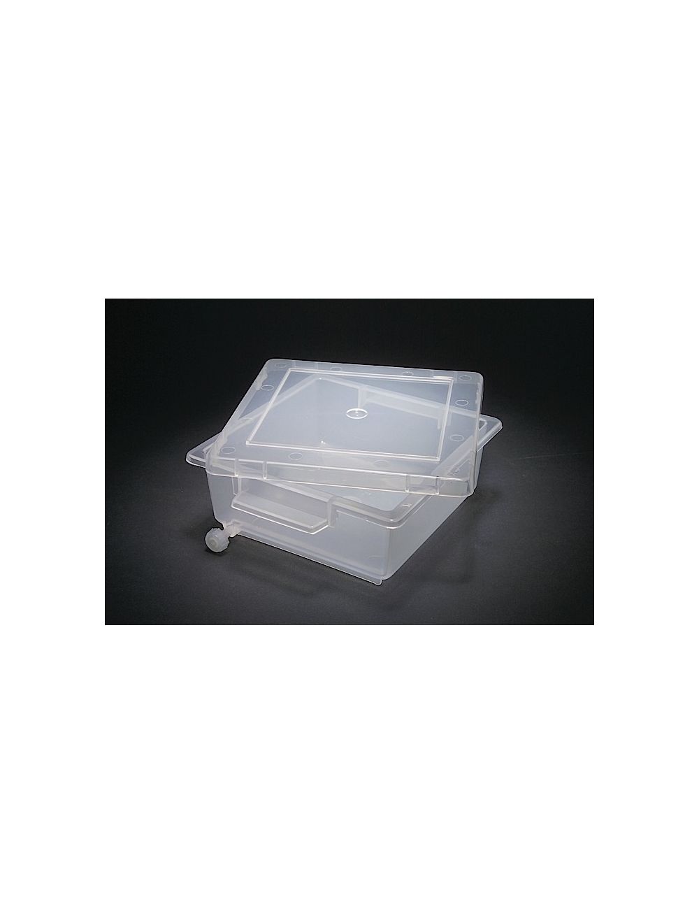 This Polypropylene Staining Tray helps in staining, fixing, de-staining, and handling fragile electrophoresis gels and membranes. Tray, as well as cover, will resist temperatures from -70° to 70° Celsius. The LDPE plug provides a leak-proof seal and allows easy liquid drainage.