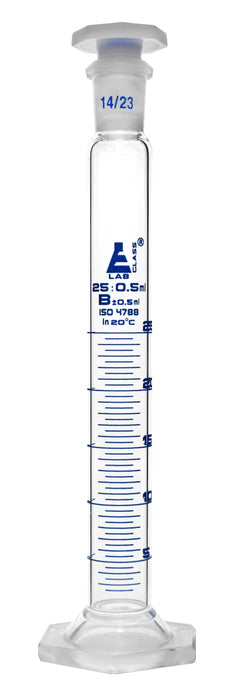 Measuring Cylinder, fitted with an interchangeable 14/23 polypropylene stopper. Class B. Made of high quality borosilicate glass. 10ml capacity, 0.5ml graduation lines, marked every 1ml. Blue graduations. Stands 7.75" tall, and has a base measuring 2". This cylinder has a hexagonal base for stability.