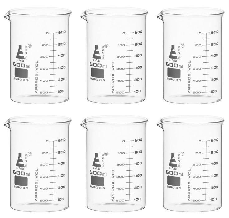 Here is the rephrased and corrected text: Made from high-quality, heavy-duty Borosilicate 3.3 glass, these beakers offer excellent strength against breakage. Designed for professional laboratories, they are also ideal for classroom, garage, and home use. This pack of six beakers has a 600ml capacity each, featuring white printed graduation lines every 50ml. They meet ASTM standards with dual scale graduations as per ASTM-E960. These beakers boast superior heat and chemical durability, being microwavable and autoclavable with low temperature gradients that can withstand high temperatures and thermal shocks. Manufactured by Eisco Labs, these products are made using state-of-the-art equipment and adhere to the highest standards of quality control. Each product is carefully designed by a team of laboratory professionals and experienced engineers with quality and durability in mind. The pack includes six 600ml capacity, low-form beakers made from Borosilicate 3.3 Glass. Each beaker features a dual graduation scale as per ASTM-E960, with graduation lines every 50ml, and has a spout for easy pouring. The uniform walls provide excellent strength against breakage. Each beaker stands 5.3" tall, with an inner diameter of 87.5mm and an outer diameter of 90mm. Eisco Labs' Borosilicate glass has the following heat tolerances: Strain Point -515°C, Annealing Point 565°C, and Softening Point 820°C. Eisco Labs proudly manufactures its own products using state-of-the-art equipment and adheres to the highest standards of quality control. Each product is carefully designed by a team of laboratory professionals and experienced engineers with quality and durability in mind. They are manufactured with only the highest-grade raw materials, according to international quality standards, to ensure they can withstand use in even the toughest laboratory environments.