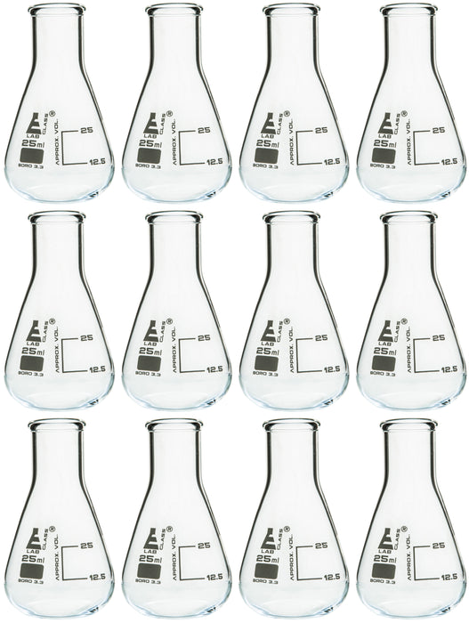Here is the corrected text: This pack of 12 Erlenmeyer flasks, each with a 25mL capacity, features easy-to-read white enamel graduations every 12.5mL. Made from high-quality, heavy-duty borosilicate 3.3 glass, these flasks offer excellent strength against breakage and are microwavable and autoclavable, with superior chemical durability. They can withstand high temperatures and thermal shocks due to their uniform wall thickness, ideal for heating, and reinforced rim, which protects against high impacts. Conforming to DIN ISO 1773 standards for narrow-neck conical flasks, these Erlenmeyer flasks offer superior chemical durability and heat tolerance, making them an excellent choice for professional laboratories, science classrooms, and household use. The borosilicate glass used in these flasks has the following heat tolerances: strain point 515°C, annealing point 565°C, and softening point 820°C.