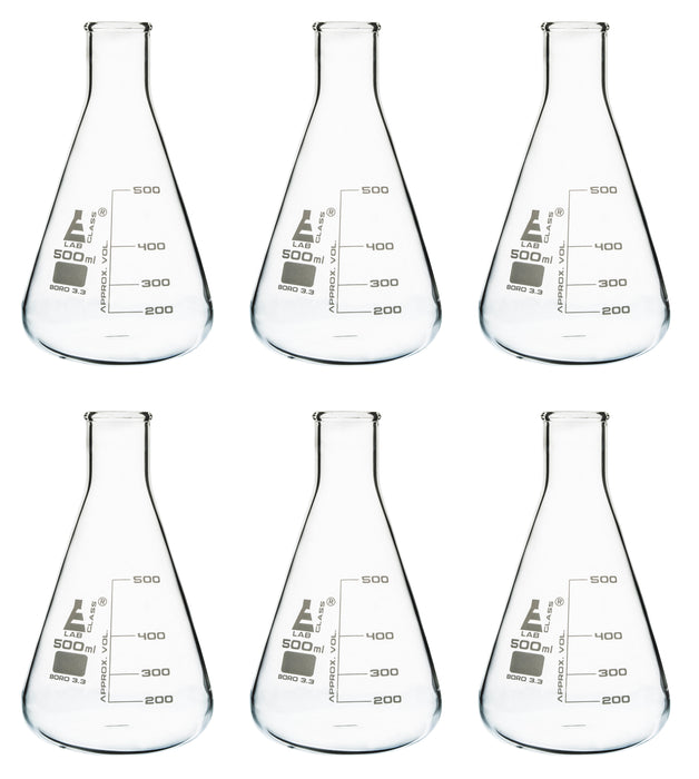 Here is the corrected text: This pack of six 500mL Erlenmeyer flasks features narrow necks and is made of heavy-duty borosilicate 3.3 glass. Each flask has a 500mL capacity, easy-to-read white enamel graduations every 100mL, uniform wall thickness ideal for heating, and a reinforced rim to protect against accidental impacts. Made to meet DIN ISO 1773 standards for conical flasks, these flasks are autoclavable, microwavable, and offer superior chemical durability. They can withstand high temperatures and thermal shocks, with a low temperature gradient. The borosilicate glass has the following heat tolerances: strain point 515°C, annealing point 565°C, and softening point 820°C. These flasks are designed for use in professional laboratories but are also an ideal choice for science classrooms and household use.