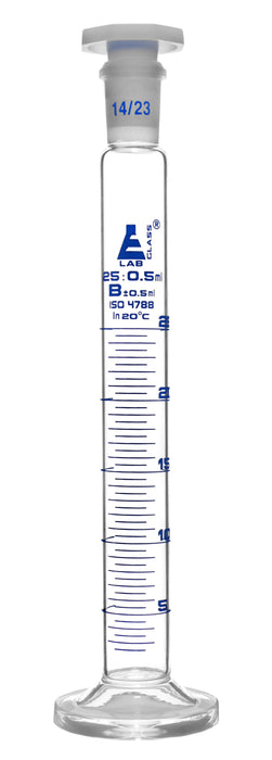 Here is the corrected text: This Class B measuring cylinder is made of high-quality borosilicate 3.3 glass and features an interchangeable 14/23 polypropylene stopper. The cylinder has a capacity of 25ml, with 1ml graduation lines marked every 5ml, and blue graduations. It stands 7.5" tall, with a base diameter of 1.9" and a body diameter of 0.8". The round base provides stability. Made from Eisco Labs borosilicate glass, this cylinder has the following heat tolerances: strain point -515°C, annealing point 565°C, and softening point 820°C.