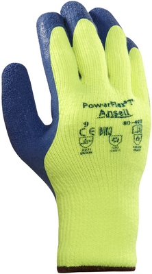 Glove^ PowerFlex T HI-Viz Yellow 80-400* blue natural latex coating dipped on a Hi Viz terry liner, general purpose glove, 6 dozen pair per case