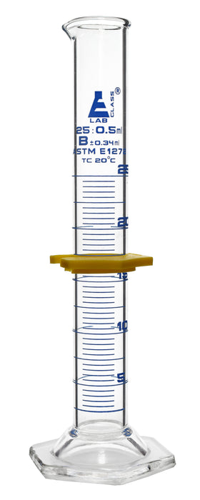 25ml capacity measuring cylinder made of high quality, heavy duty Borosilicate 3.3 glass. Hexagonal base for extra stability. Class B tolerance, ±0.34ml as per ISO/ASTM. Fitted with a plastic, hexagonal protective collar.Cylinder stands 6.75" tall, with a base measuring 2.3" wide. Inner diameter of cylinder body measures 0.7", and outer diameter measures 0.85".Autoclavable, with superior chemical durability. Low temperature gradient- can withstand high temperatures & thermal shocks. Eisco Labs Borosilicate glass has the following heat tolerances: Strain Point -515°C | Annealing Point 565°C | Softening Point 820°C.