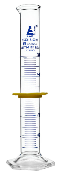 50ml capacity measuring cylinder made of high quality, heavy duty Borosilicate 3.3 glass. Hexagonal base for extra stability. Class B tolerance, ±0.50ml as per ISO/ASTM. Fitted with a plastic, hexagonal protective collar.Cylinder stands 7.75" tall, with a base measuring 2.4" wide. Inner diameter of cylinder body measures 0.9", and outer diameter measures 1".Autoclavable, with superior chemical durability. Low temperature gradient- can withstand high temperatures & thermal shocks. Eisco Labs Borosilicate glass has the following heat tolerances: Strain Point -515°C | Annealing Point 565°C | Softening Point 820°C.
