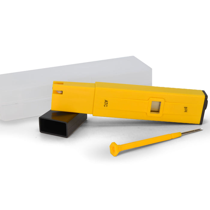 This pocket-sized digital pH tester measures pH from 0.0 to 14.0 with an accuracy of ±0.1. It comes with a calibration screwdriver, instructions, and a plastic storage case. The device is lightweight, portable, and splash-proof, making it ideal for use in environments between 0°C and 50°C. It is perfect for laboratory, classroom, and field applications.