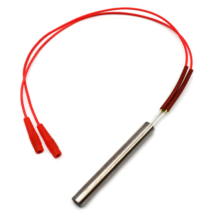 This heater immersion element is specifically designed for use with metal block calorimeters. It features heat-resisting insulation, terminating in 4mm sockets, and operates at 12 volts and 50 watts. The battery measures 4 inches long, while the wires each measure 17.5 inches. The total length of the item is approximately 21.5 inches.