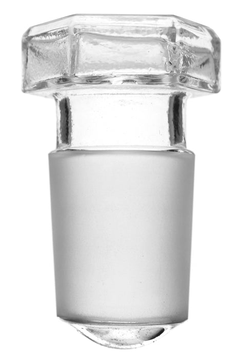 Hollow stopper made of high quality, 3.3 borosilicate glass. Stopper features a hexagonal shape top and a round End. 29/32 cone size. Stopper measures 2.5" long, and top measures 1.5" wide.