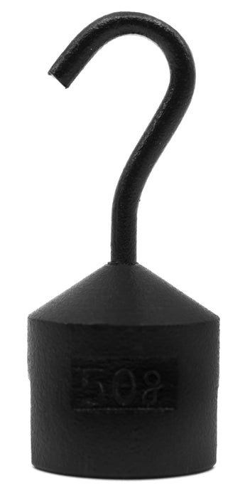 Single hooked weight. 50 grams (0.11lbs). Cylindrical with cone shaped top. Features hook for easy lifting and hanging. Bottom slot allows for other hooked weights to be attached in tandem. Stamped with weight for easy identification. Made of powder coated steel.Weight measures 0.8" in diameter, and is 2" in height.