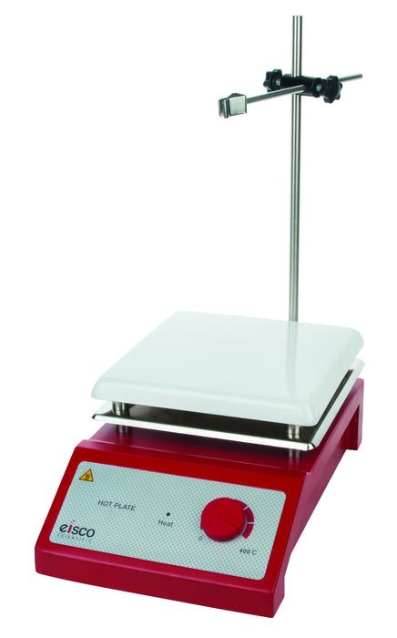 EISCO introduces a stylish and economical range of hot plates and stirrers for general laboratory use. The plate features a ceramic-coated aluminum construction that allows for excellent chemical resistance. Equipped with powerful heating elements, these units provide very quick heating of samples. Key specifications include: Plate Material: Ceramic-coated metal; Plate Dimensions: 190 x 190 mm; Heater Power: 650 W; Maximum Plate Temperature: 400°C; Control: Analog; Accessories: Rod and clamp holder; Dimensions: 33 x 19.5 x 13 cm; Weight: 4 kg; Input: 110/120 V AC, 60 Hz.