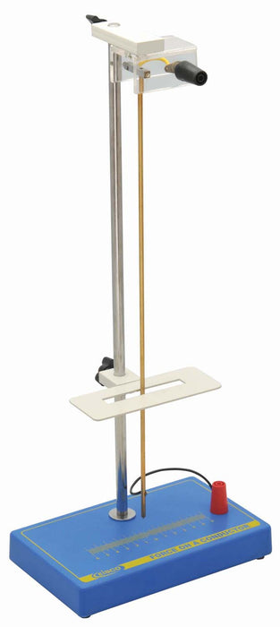 This apparatus is designed to demonstrate the effect of a magnetic field on a current-carrying conductor. The base features a metal rod with a fixing point for the conductor, which is linked to a flexible wire attached to the socket of the platform. A magnet is positioned on a support, and the device is fitted with 4mm connecting sockets.
