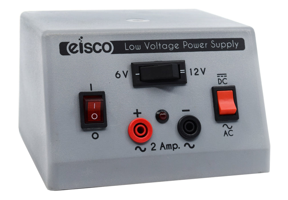 Eisco Lab's "power pack" is a low-voltage power supply that operates on 110V power and outputs 6 or 12V at 2A, either AC or DC, selectable by convenient switches. The unit measures 5.25 inches wide, 5 inches long, and 3.5 inches tall, and includes a 6-foot power cord. This power supply is ideal for use in electrical engineering labs, where students can utilize it to understand the differences between AC and DC currents and how various electrical components react to different types of currents. It's also suitable for electronics courses, providing hands-on training with low-voltage AC and DC circuits, learning about rectifiers, transformers, and power electronics. The power supply is useful for prototyping and testing circuits and components like LEDs, motors, or small solenoids that may require either 6V or 12V DC or AC. Many development boards, such as Arduino or Raspberry Pi, can be powered using 6V or 12V DC, providing flexibility for different setups. Sensors and actuators often require stable power supplies, and having both AC and DC options can be useful for various tests. Additionally, many remote-controlled models and toys operate on 6V or 12V DC, and a dual-mode supply can provide reliable power for these projects. Hobbyists working on home automation, small robots, or other DIY electronics projects can benefit from this versatile power supply. Furthermore, some portable medical devices, such as small pumps or diagnostic equipment, operate on low voltages and may need both AC and DC for comprehensive testing.