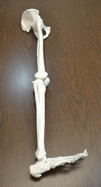 Life-Size Leg Model This model includes the following bones: a half pelvis, full-size femur, patella, tibia, fibula, tarsals, metatarsals, and phalanges. It features an extraordinary amount of anatomical detail. This is a medical-quality anatomical model.