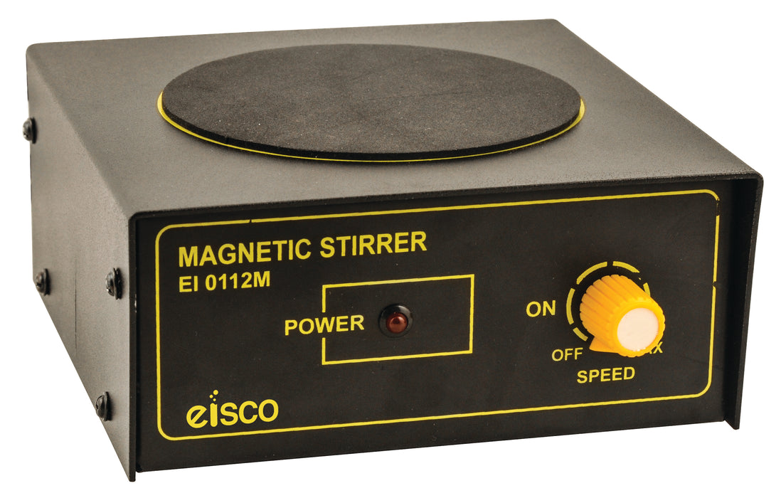 This magnetic stirrer features a compact and portable design, making it ideal for lightweight stirring up to 500ml. Operation is simple, with a single knob controlling power and speed. A red light indicates when the unit is powered on. The device comes with a power supply and wall adapter, and can operate on either 12V or 220V - 50 Hz. Its compact size measures 6" in length, 6" in width, and 3" in height.