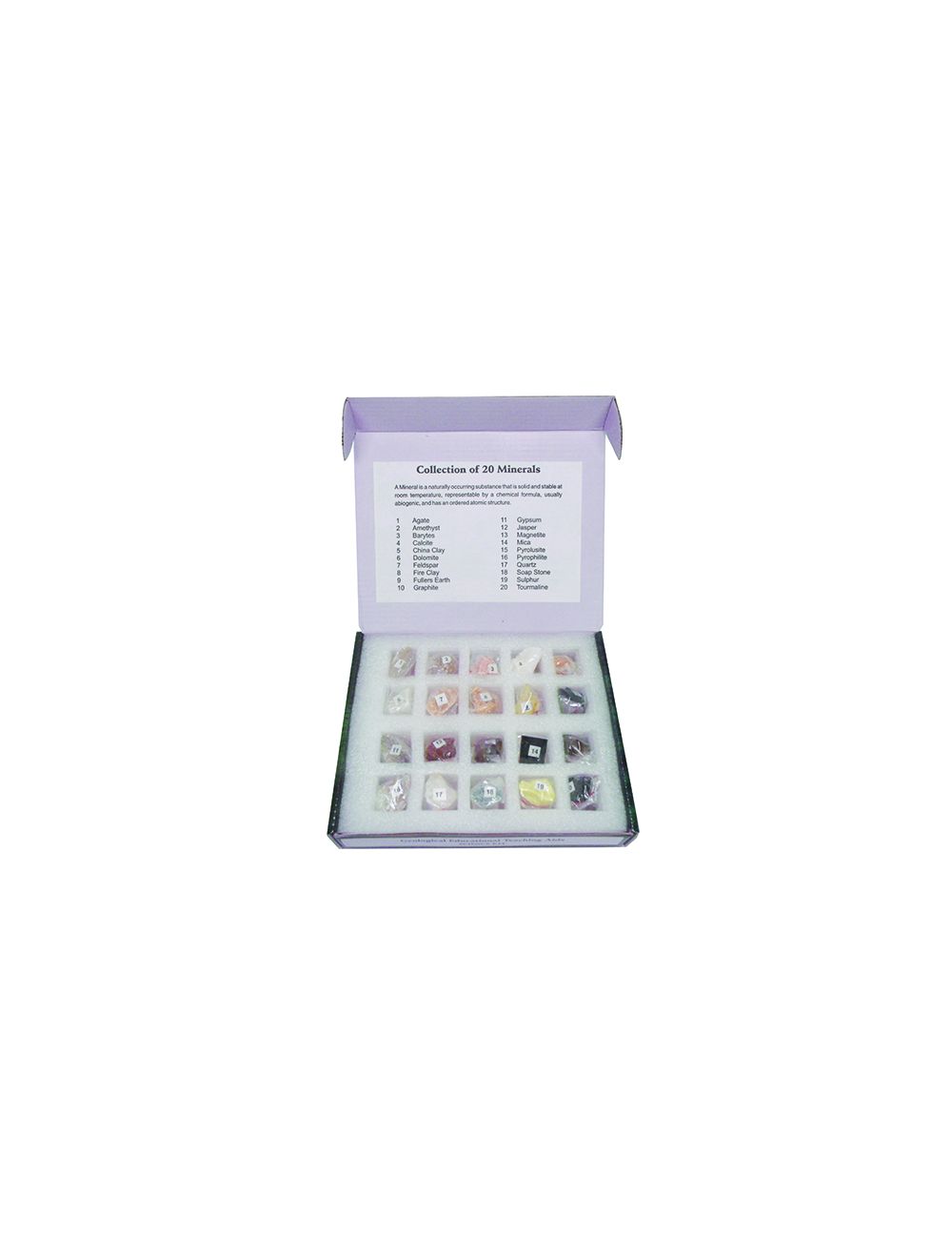 This collection contains 20 types of basic mineral specimens. The mineral specimens included in this set feature some of the following: agate, amethyst, barytes, calcite, china clay, dolomite, feldspar, fire clay, fuller's earth, graphite, gypsum, jasper, magnetite, mica, pyrolusite, pyrophyllite, quartz, soapstone, sulfur, and tourmaline. The average size of each specimen is 2 cm x 3 cm x 1.5 cm.