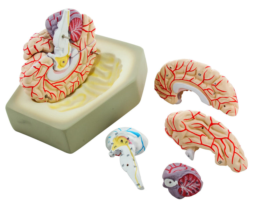 Eisco Labs presents a life-size human brain model featuring arteries, comprising eight parts and accompanied by a stand, crafted from slightly malleable plastic and meticulously hand-painted.