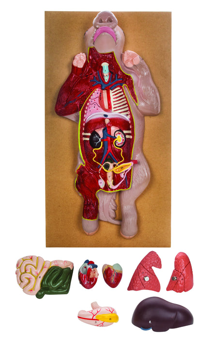 Model showing the internal dissection of pig in which one can study important exterior parts and interior parts showing various organs and systems. Mounted on base. Supplied with English Key Card. Size 56 x 30 x 7 cm approx. Weight 2780 g approx.