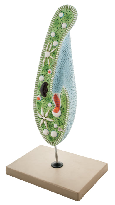 This slipper animalcule Paramecium model is designed for biological study and depicts the basic internal structures and morphology of a paramecium. The model is numbered and includes a key card for identifying its features. Mounted on a base for display, it is made of durable polyvinyl chloride (PVC) plastic, which is corrosion-resistant, lightweight, and has high strength, resisting reactions with acids, gasoline, alcohol, and hydrocarbons. The model (not including the base) measures 5.25 inches wide, 15.5 inches long, and 3.75 inches tall. The base measures 8 inches wide, 18 inches long, and sits 1 inch high. The total height of this model measures 4.75 inches.
