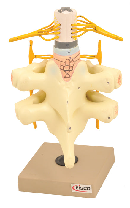 This life-size model of the spinal cord is mounted on a stand with a base and provides a detailed view of the spinal cord, nerves, ganglia, and vertebrae. Important structures are numbered on the model and can be easily identified using the included key card, which labels 17 features including the pedicle; spinous and transverse process; duramater; dorsal and ventral roots; and sympathetic trunk and ganglion. Designed with input from medical and educational professionals, this model is custom-molded using high-quality, non-toxic polymers and polyvinyl chloride (PVC) for durability, ensuring years of use. Skilled artists have hand-painted the model to deliver an exceptionally high level of realism and detail, using vibrant, safe, eco-friendly paint. The model measures 6.3"L x 6.3"W x 11.4"H.