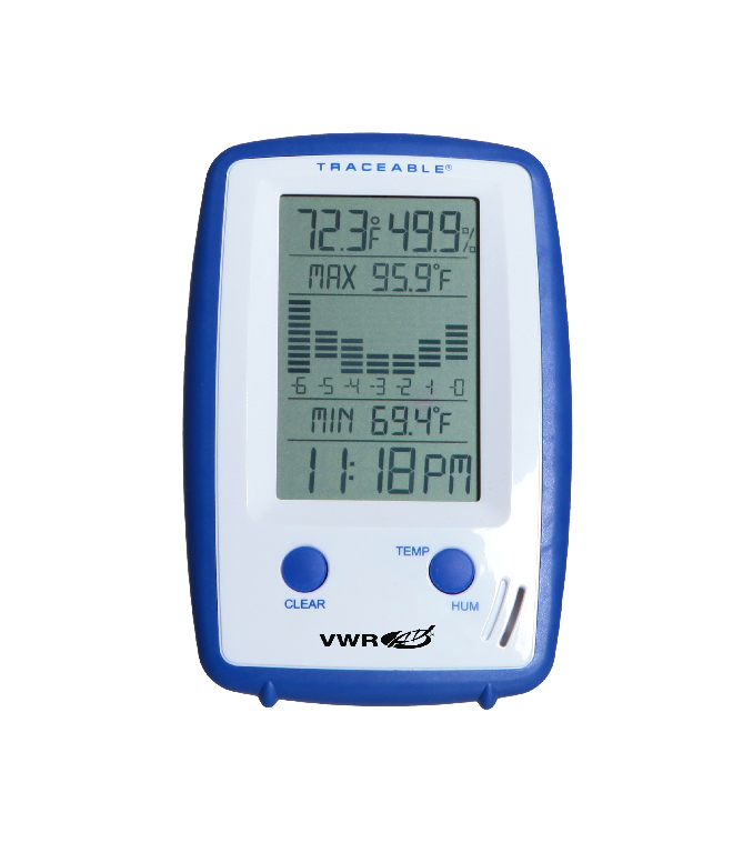 This digital temperature and humidity meter continuously monitors and displays readings numerically and graphically. It can store up to 7 days of data, which cannot be cleared but is overwritten by the next day's measurements. The internal sensor makes it ideal for use in hoods, stores, cleanrooms, incubators, and drying or environmental chambers. The device simultaneously displays minimum and maximum temperatures, as well as current temperature and humidity readings, along with a 7-day graph. It has a temperature range of -4°F to 122°F (-20°C to 50°C) and a humidity range of 0% to 90% RH. The temperature accuracy is ±0.4°C, while the humidity resolution is 0.1% RH, with an accuracy of ±4% RH (between 20% and 80% RH) and ±5% RH elsewhere. The meter includes NIST-traceable calibration, which ensures accurate and reliable measurements. This means that a 17025 accredited calibration test lab has confirmed that the product meets or exceeds all stated specifications, saving you time and money by not having to calibrate separately. The NIST-traceable certification also helps you meet quality standards and regulatory compliance for ISO, FDA, cGMP, VFC, CAP, CLIA, and Joint Commission requirements. The device features a 2.5" LCD display and comes with a flip-out stand, wall mount, double-sided tape mount, and AAA battery. It is CE certified and includes a NIST-Traceable certificate with data.