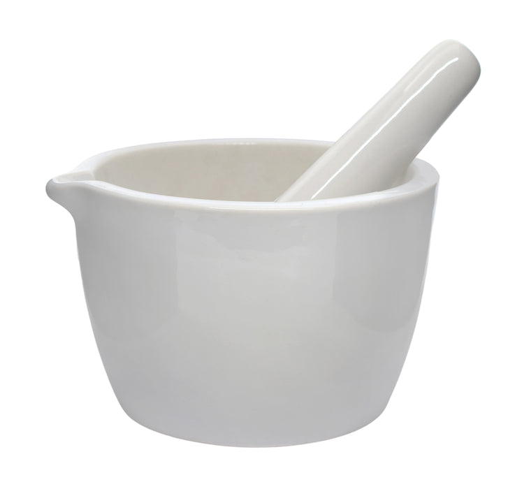 Single, heavy-duty mortar and pestle set with a 13.5oz (400ml) capacity, perfect for grinding and crushing powders, pills, pigments, and more. The high walls prevent material from spilling out while being crushed. Both the mortar and pestle are made of solid porcelain, resistant to chips and cracks. The inside grinding surface of the mortar and the rounded end of the pestle are unglazed for precise grinding and crushing. The mortar features a contoured spout for pouring and transferring crushed material. The mortar measures 5.3 inches wide and 3.4 inches tall, while the pestle measures 7.4 inches in length, with a rounded end measuring 1.9 inches in diameter.