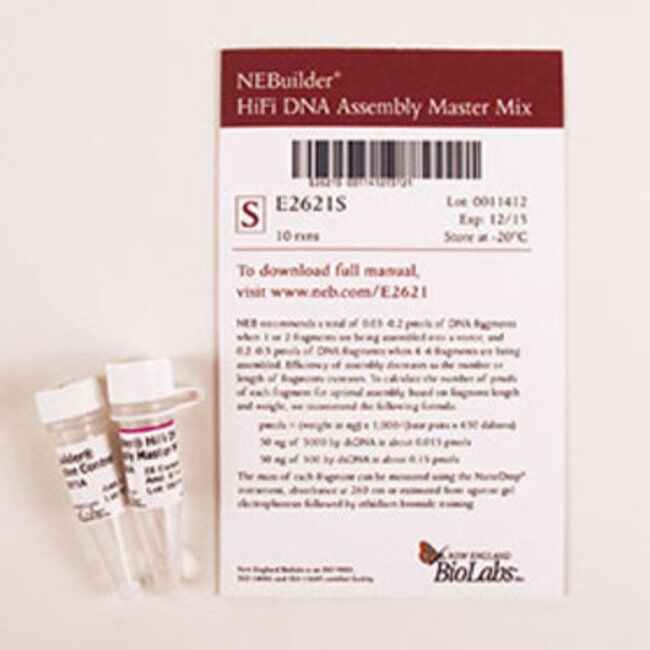 NEBuilder HiFi DNA Assembly Master Mix - 50 rxns. NEBuilder HiFi DNA Assembly Master Mix was developed to improve the efficiency and accuracy of DNA assembly. This method allows for seamless assembly of multiple DNA fragments, regardless of fragment length or end compatibility. This method has been used to assemble either single-stranded oligonucleotides or different sizes of DNA fragments with varied overlaps (15–80 bp). It has utility for the synthetic biology community, as well as those interested in one-step cloning of multiple fragments due to its ease of use, flexibility and simple master-mix format. The reaction includes different enzymes that work together in the same buffer. The exonuclease creates single-stranded 3´ overhangs that facilitate the annealing of fragments that share complementarity at one end (the overlap region). The polymerase fills in gaps within each annealed fragment. The DNA ligase seals nicks in the assembled DNA.