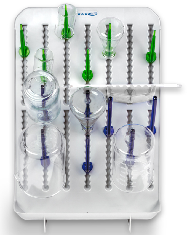 Here is the corrected text: The VWR drying rack is a versatile and durable product made of easy-to-clean polystyrene (PS). It can be used on counters with its integrated hinged stand or mounted on walls using the included guide and hardware. The rack has a weight capacity of up to 77 pounds. Its features include channels designed for enhanced configuration and protection against breakage, unique drying baskets that collect small items, and pegs with special angles that provide a better hold – especially for large and heavy pieces. The SureGrip hook securely grips glassware in place. This product includes 72 pegs (36 small and 36 large), two drying baskets, and one drainage tube. It measures 26 inches wide, 17.4 inches long, and 5.5 inches high, and is available in assorted colors.