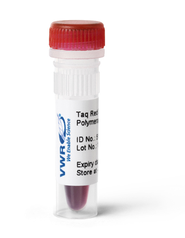 Red Taq DNA Polymerase is a blend of VWR® Taq DNA polymerase combined with an inert red dye. The dye enables quick visual recognition of reactions to which enzyme has been added, as well as confirmation of complete mixing., Red Taq DNA polymerase concentration | : 5 Units/μl | 10X Key Buffer | : Tris-HCl pH 8.5; (NH₄)₂SO₂, 15 mM MgCl₂, 1% Tween® 20 10X Extra Buffer | : Tris-HCl pH 8.3; KCl, 15 mM MgCl₂, 1% Tween®20 Taq DNA polymerase is isolated from Thermus aquaticus, and has a molecular weight of approximately 94 kDa. VWR® Taq DNA Polymerase has both a 5' to 3' DNA polymerase and a double strand 5' to 3' exonuclease activity. The enzyme lacks a 3'→5' exonuclease activity (no proofreading ability). It leaves an A' overhang, which makes the enzyme ideal for TA cloning. Taq DNA polymerase is suitable for standard testing, routine PCR, screening and high throughput testing. Long term storage at -20 °C. Product expiry at -20 °C is stated on the label. Optional: Store at 4 °C for up to 6 months. Red Taq DNA Polymerase is supplied with both Key Buffer and Extra Buffer. Additional MgCl₂ is included with each kit to enable optimization. Key Buffer (NH⁴⁺) gives a superior amplification signal (high yield) minimizing the need for optimization of the Mg²⁺ concentration or the annealing temperature in most primer-template systems. Extra Buffer is a traditional potassium (K⁺) buffer. Extra Buffer promotes high specificity, but careful optimization of primer annealing temperatures and Mg²⁺ concentrations may be required., 02_BulletPoint: Ideal choice for routine applications | High performance, thermostable DNA polymerase | Optimal for TA cloning | dUTP incorporation possible | Processes up to 5 kb | Leaves a 3'dA overhang, 13_Caution: For Research Use Only. Not for use in diagnostic procedures., Concentration: 5 U/µl, Red Taq DNA Polymerase is a blend of VWR® Taq DNA polymerase combined with an inert red dye. The dye enables quick visual recognition of reactions to which enzyme has been added, as well as confirmation of complete mixing., Red Taq DNA polymerase concentration | : 5 Units/μl | 10X Key Buffer | : Tris-HCl pH 8.5; (NH₄)₂SO₂, 15 mM MgCl₂, 1% Tween® 20 10X Extra Buffer | : Tris-HCl pH 8.3; KCl, 15 mM MgCl₂, 1% Tween®20 Taq DNA polymerase is isolated from Thermus aquaticus, and has a molecular weight of approximately 94 kDa. VWR® Taq DNA Polymerase has both a 5' to 3' DNA polymerase and a double strand 5' to 3' exonuclease activity. The enzyme lacks a 3'→5' exonuclease activity (no proofreading ability). It leaves an A' overhang, which makes the enzyme ideal for TA cloning. Taq DNA polymerase is suitable for standard testing, routine PCR, screening and high throughput testing. Long term storage at -20 °C. Product expiry at -20 °C is stated on the label. Optional: Store at 4 °C for up to 6 months. Red Taq DNA Polymerase is supplied with both Key Buffer and Extra Buffer. Additional MgCl₂ is included with each kit to enable optimization. Key Buffer (NH⁴⁺) gives a superior amplification signal (high yield) minimizing the need for optimization of the Mg²⁺ concentration or the annealing temperature in most primer-template systems. Extra Buffer is a traditional potassium (K⁺) buffer. Extra Buffer promotes high specificity, but careful optimization of primer annealing temperatures and Mg²⁺ concentrations may be required., 02_BulletPoint: Ideal choice for routine applications | High performance, thermostable DNA polymerase | Optimal for TA cloning | dUTP incorporation possible | Processes up to 5 kb | Leaves a 3'dA overhang, 13_Caution: For Research Use Only. Not for use in diagnostic procedures., Red Taq DNA Polymerase with 10X Key Buffer and 10X Extra Buffer, Size: 1000 units, Cat. No.: 76620-488, Units: EA, Concentration: 5 U/µl, Red Taq DNA Polymerase is a blend of VWR® Taq DNA polymerase combined with an inert red dye. The dye enables quick visual recognition of reactions to which enzyme has been added, as well as confirmation of complete mixing., Red Taq DNA polymerase concentration | : 5 Units/μl | 10X Key Buffer | : Tris-HCl pH 8.5; (NH₄)₂SO₂, 15 mM MgCl₂, 1% Tween® 20 10X Extra Buffer | : Tris-HCl pH 8.3; KCl, 15 mM MgCl₂, 1% Tween®20 Taq DNA polymerase is isolated from Thermus aquaticus, and has a molecular weight of approximately 94 kDa. VWR® Taq DNA Polymerase has both a 5' to 3' DNA polymerase and a double strand 5' to 3' exonuclease activity. The enzyme lacks a 3'→5' exonuclease activity (no proofreading ability). It leaves an A' overhang, which makes the enzyme ideal for TA cloning. Taq DNA polymerase is suitable for standard testing, routine PCR, screening and high throughput testing. Long term storage at -20 °C. Product expiry at -20 °C is stated on the label. Optional: Store at 4 °C for up to 6 months. Red Taq DNA Polymerase is supplied with both Key Buffer and Extra Buffer. Additional MgCl₂ is included with each kit to enable optimization. Key Buffer (NH⁴⁺) gives a superior amplification signal (high yield) minimizing the need for optimization of the Mg²⁺ concentration or the annealing temperature in most primer-template systems. Extra Buffer is a traditional potassium (K⁺) buffer. Extra Buffer promotes high specificity, but careful optimization of primer annealing temperatures and Mg²⁺ concentrations may be required., 02_BulletPoint: Ideal choice for routine applications | High performance, thermostable DNA polymerase | Optimal for TA cloning | dUTP incorporation possible | Processes up to 5 kb | Leaves a 3'dA overhang, 13_Caution: For Research Use Only. Not for use in diagnostic procedures., Red Taq DNA Polymerase with 10X Key Buffer and 10X Extra Buffer, Size: 500 units, Cat. No.: 76620-486, Units: EA, Concentration: 5 U/µl, Red Taq DNA Polymerase is a blend of VWR® Taq DNA polymerase combined with an inert red dye. The dye enables quick visual recognition of reactions to w