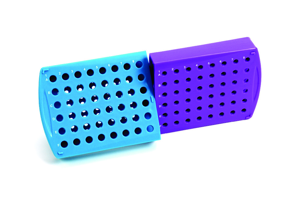 Dilute or remove concentrates using the Duo Tube Rack, which features a single rack with multiple orientation options. The 0.2 mL tube wells are arranged in a standard 96-well format and are compatible with PCR transfer trays. By rotating the rack, you can customize its application to work with various tube sizes, including 96 x 0.2 mL tubes and 48 x 0.5 mL tubes, or 96 x 0.2 mL tubes and 48 x 1.5 mL tubes. You can also flip the rack to accommodate 48 x 0.5 mL tubes and 48 x 1.5 mL tubes, or turn a module to work with a total of 96 x 1.5 mL tubes. The Duo Tube Rack offers several benefits, including different orientations that provide unique dilution options, tapered wells that securely suspend tubes upright, easy tube removal, autoclavability, and an imprinted alphanumeric system for quick tube identification. Color: Purple and Blue. VWR Rota-Rack Duo Tube Rack. Dimensions: 296 x 118 x 34 mm (11⅝ x 4⅝ x 1⅜"). Cat. No.: 89140-272.