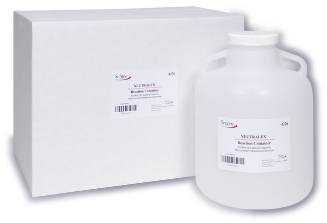 Thick walled HDPE waste collection and treatment container with 89 mm (3.5 in.) wide mouth to receive Neutralex pouch. Designed for treatment of formalin, paraformaldehyde, glutaraldehyde and OPA solutions.