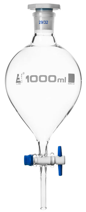 Eisco Labs offers a pear-shaped borosilicate glass separating funnel with a capacity of 1000ml and a socket size of 29/32. This product features borosilicate glass construction, an interchangeable plastic stopper, and a PTFE key stopcock. The Eisco Labs borosilicate glass has the following heat tolerances: strain point at 515°C, annealing point at 565°C, and softening point at 820°C.