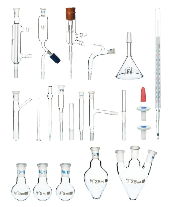 This set, containing 22 items, includes a 10/19 ground joint for maximum versatility. With this set, you can construct over 20 standard assemblies, ranging from simple reflux to fractional distillation. Designed for quantities of starting material up to 15g, it is housed in a die-cut foam-lined box. The set consists of: one Liebig condenser; one 20ml dropping funnel; one 25ml pear-shaped flask; one 25ml three-neck flask; three 5ml round-bottom flasks; one air leak/steam inlet; one thermometer (-10°C to 250°C); one dropping pipette; one rubber teat; one receiver adapter; two stoppers; one still head; one air condenser; one filter funnel; one receiver tube; one Willstätter nail; one gas inlet tube; and one drying tube with stirrer.
