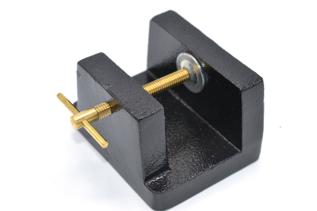 This cast metal clamp features an acid-resistant paint finish, 40mm-high jaws, and a fitted thumb screw. It is designed for holding flat objects such as manometers or boards up to 34mm thick in the vertical position. The clamp measures 9.5cm in length and 7.5cm in width.