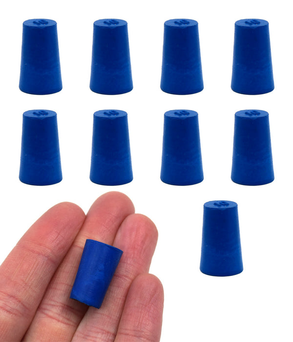 Solid blue neoprene stoppers: Bottom 10mm Top 12.5mm Length 20mm Made from long lasting neoprene rubber, oil resistant, Use up to temps of 250°F / 120°C , Pack of 10